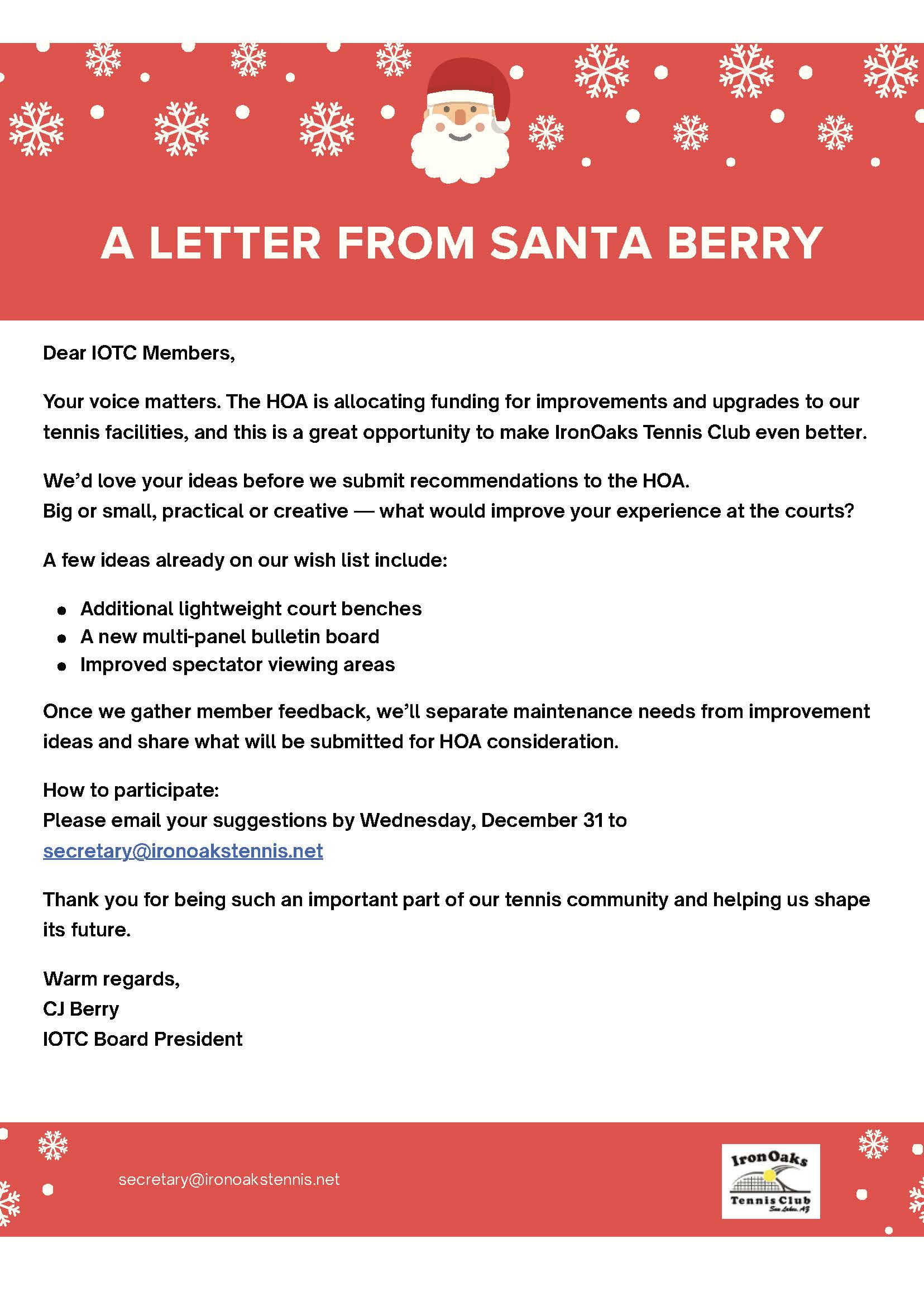 Dear IronOaks Tennis Club Members,